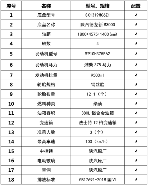 僅用軸距(mm):1800+3775+1400,1800+3975+1400,1800+4575+1400,該車為路面同步碎石封層專用車輛,主要專用裝置為瀝青罐,碎石箱及灑布系統.側防護材料鋁合金,采用螺栓連接,后防護為專用裝置代替,下緣離地高450mm,ABS系統生產廠家及型號分別為:西安正昌電子股份有限公司(ZQFB-V);后部照明燈僅在駐車狀態下使用,起夜間照明作用,行駛過程中不可點亮。隨底盤選裝駕駛室。